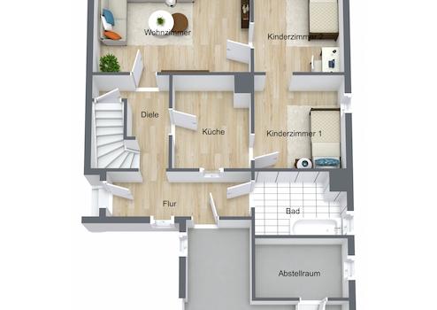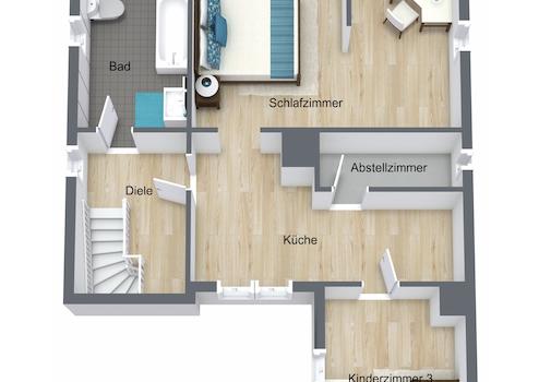 Diele, Bad, Küche mit Abstellzimmer, Kinderzimmer 3, Schlafzimmer,