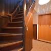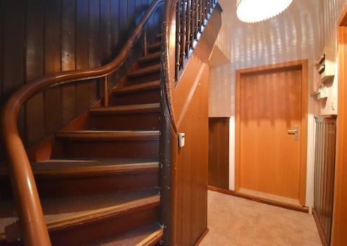 Holztreppe mit Linoleumbelag und Handlauf, Treppenlift