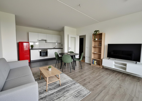 - (teil-)möbliert inkl. EBK, Kühlschrank, Waschtrockner, Bettsofa, Wohnzimmer-Tisch & Stühle