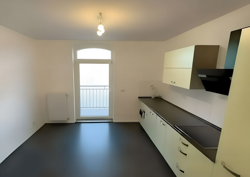 Voll ausgestattete Einbauküche mit Balkonzugang
