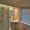 Das moderne Bad verfügt über eine Dusche mit Glastüren, einem Waschbecken und einem Handtuchheizkörper.