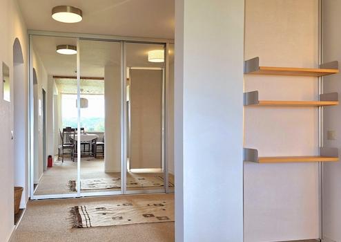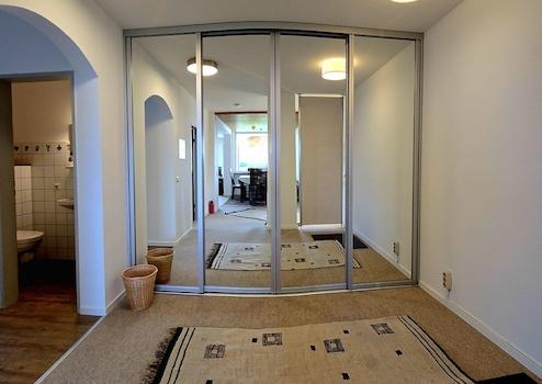 Eine Kleiderschranklösung mit großflächigen Spiegeltüren bringt sehr viel Licht in diesen Bereich und erweitert den optischen Raum enorm. Durch die Spiegel erhält man einen zweiten Blick auf die Berge und den Säntis. Sehr schön…
