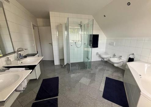 Im Obergeschoss befinden sich drei geräumige Schlafzimmer sowie zwei stilvolle Bäder, die Raum für Familie und Gäste schaffen. Hier genießen Sie Rückzugsmöglichkeiten und gleichzeitig großzügiges Wohnen auf hohem Niveau. Der ausgebaute Spitzboden bietet zwei weitere Räume zur freien Gestaltung.