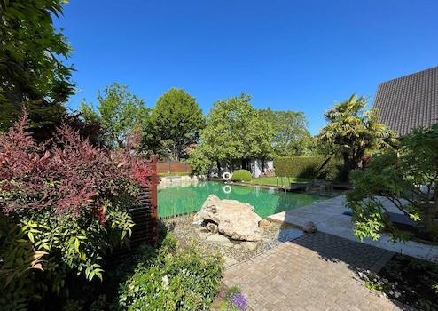 Auch im Inneren überzeugt das Haus mit einer durchdachten Raumaufteilung und einer angenehmen Wohnatmosphäre. Das helle Wohnzimmer bildet das Herzstück des Hauses und lädt mit einem Kaminofen zu gemütlichen Abenden ein. Große Fenster eröffnen den Blick in den liebevoll angelegten Garten, der mit einer privaten Wellness-Oase samt Pool begeistert - ideal für entspannte Stunden und Erholung direkt am eigenen Zuhause. Eine separate Küche mit Einbaumöbeln bietet ausreichend Platz für den Alltag, während der angrenzende Hauswirtschaftsraum für zusätzliche Ordnung und Funktionalität sorgt. Abgerundet wird das Erdgeschoss durch einen großzügigen Eingangsbereich sowie ein praktisches Gäste-WC.