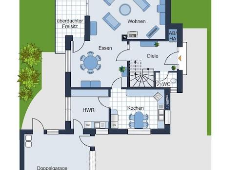 Abgerundet wird dieses Angebot durch eine Doppelgarage, die nicht nur Platz für Fahrzeuge, sondern auch Stauraum auf dem Dachboden bietet.