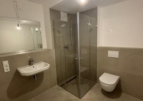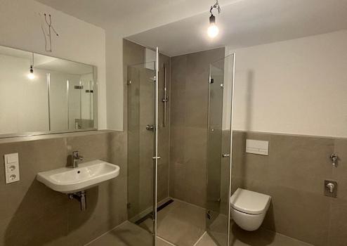 - Stilvolles Badezimmer mit moderner Sanitärausstattung und Duschabtrennungen