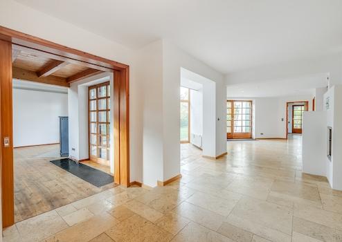 Im Erdgeschoss empfängt Sie ein großzügiger Eingangsbereich. Das beeindruckende Wohnzimmer mit offener Galerie, großer Raumhöhe, bodentiefen Fenstern und Kaminofen bildet das Herz des Hauses. Von hier wie auch von der Diele führt der Weg in den lichtdurchfluteten Wintergarten mit Blick in den Garten. Die geräumige Wohnküche bietet viel Platz für Kochen und Essen. Die Bulthaup-Küche mit Granitarbeitsplatte und hochwertigen Geräten ist ein besonderer Blickfang. Von hier gelangen Sie direkt auf die Terrasse mit Grillmöglichkeit. Ein weiteres Zimmer eignet sich ideal als Büro. Ein Garderobenraum und ein Gäste-WC vervollständigen das Erdgeschoss. Travertin- und Parkettböden sowie der Holz-Grundofen (Heizung des gesamten Hauses möglich, neben der zusätzlichen Ölheizung) unterstreichen den wohnlichen Charakter.