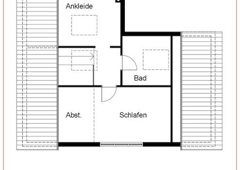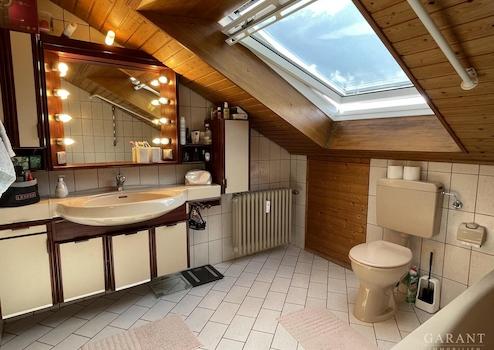 Eine stilvolle Holztreppe führt ins Dachgeschoss, das mit einem weiteren Schlafzimmer, einem separaten Ankleidezimmer und einem komfortablen Tageslichtbad mit Badewanne zusätzlichen Wohnkomfort bietet.
