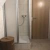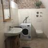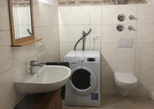 Das Badezimmer ist in zeitloser Natursteinoptik gefliest ist und verfügt über Dusche, WC, Waschbecken und Waschtrockner.