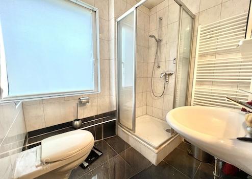 Das Badezimmer im Obergeschoss ist funktional gestaltet und verfügt über eine Dusche. Im Dachgeschoss befindet sich ein großzügiges Studio, das sich ideal als Büro oder Hobbyraum nutzen lässt. Das Studio im Dachgeschoss ist derzeit baurechtlich nicht als Wohnfläche genehmigt. Da der Dachgeschossausbau jedoch bereits vor etwa 20 Jahren erfolgt ist, besteht Bestandschutz. Zudem kann beim zuständigen Bauamt ein Antrag auf nachträgliche Baugenehmigung gestellt werden.