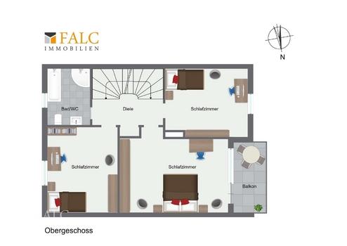 Im Erdgeschoss befindet sich zudem ein Gäste-WC, das den Komfort für Besucher erhöht. Über eine Treppe gelangen Sie in das Obergeschoss, wo drei Schlafzimmer auf Sie warten. Jedes Zimmer bietet ausreichend Platz und vielfältige Gestaltungsmöglichkeiten, um den individuellen Bedürfnissen gerecht zu werden. Ein Balkon, der von einem der Schlafzimmer aus zugänglich ist, bietet einen zusätzlichen Rückzugsort im Freien.