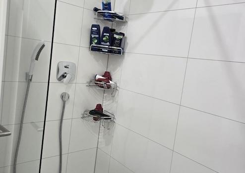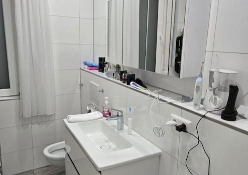 - möbliertes Badezimmer mit bodengleicher Dusche
