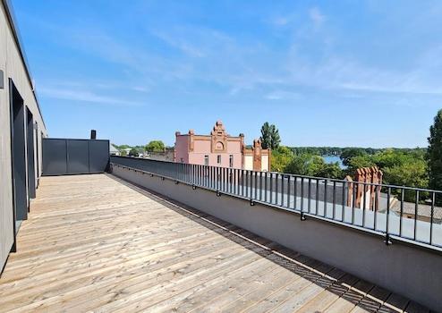 Das 2,5-Zimmer-Penthouse gehört zum Helling Hof und liegt im Wohnquartier 52° Nord. Es bietet eine faszinierende Sicht auf die Wasserlandschaft der Dahme. Die bodentiefen Fenster lassen viel natürliches Licht herein. Die großzügige von der Sonne verwöhnte Dachterrasse mit 50 m² bietet viel Platz für entspannende Stunden im Freien, Feiern mit Familie und Freunden oder das schönste Homeoffice der Stadt. Neben dem geräumigen Wohn- und Essbereich hat das Schlafzimmer über ein zusätzliches halbes Zimmer Platz für eine Umkleide oder einen Arbeitsbereich. Dieser Bereich könnte vom Schlafzimmer räumlich getrennt werden, sodass ein separates drittes Zimmer geschaffen wird. Der Eingangsbereich sieht eine große Garderobe vor. Zusammen mit einem Hauswirtschaftsraum und dem Keller ist damit ausreichend Stauraum vorhanden.