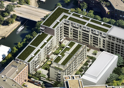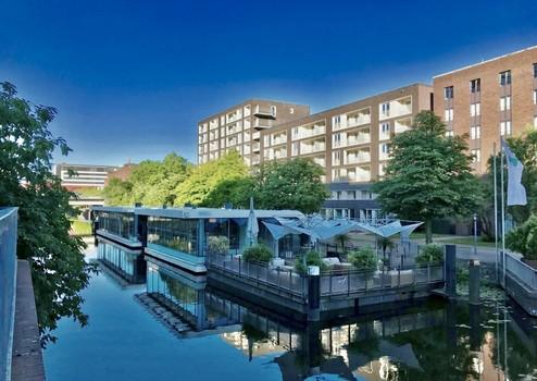 Citynaher Neubau in hervorragender Lage: Der Nagelsweg 24 befindet sich direkt an der Uferpromenade der City Süd, umgeben von mehreren Wasserkanälen. Die Umgebung kombiniert urbanes Stadtleben mit modernen Grün- und Wasserflächen.