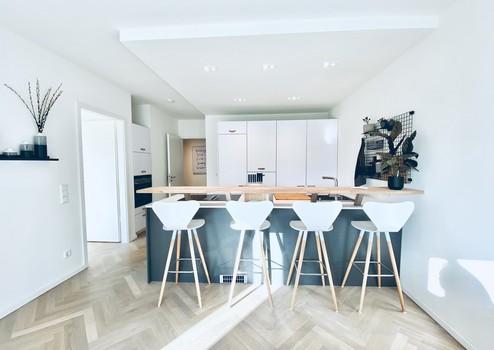 Die offene Wohnküche ist mit einer modernen Design Einbauküche inkl. sämtlicher Elektrogeräte ausgestattet. Durch das abgestimmte Design der Farben mit weißen Fronten und einer zeitlosen Arbeitsplatte fügt sich die Wohnküche harmonisch in Ihren individuellen Wohnstil ein. Die Einbauküche bietet außerordentlich viel Stauraum, welcher u.a. durch einen Vorratsschrank mit Innenauszügen, einen Haushaltsschrank sowie viele Schubladen geschaffen wird. Zudem sorgen die auf Arbeitshöhe eingebaute Geschirrspülmaschine und der Backofen für ein rückenfreundliches Arbeiten. Die Wandnische mit integriertem Hochschrank fügt sich harmonisch in das Gesamtbild ein. Außerdem gewährleistet das Induktionskochfeld mit integriertem Wrasenabzug (Downlüfter) eine komplett freie Sicht in das Wohnzimmer (ohne störende Abzugshaube). Ein besonderes Highlight ist der über der Küche abgehängte Decken-Quader mit integrierter Spot-Beleuchtung. Auf der Rückseite der Küchenzeile entsteht durch die überstehende Arbeitsplatte ein kommunikativer Essplatz, welcher Küche und Wohnzimmer verbindet und das Kochen zum Event macht.