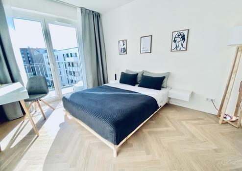 Vom Wohnzimmer aus gelangt man in den Schlafbereich, welcher über ein separates Ankleidezimmer mit reichlich Platz für jede Bedürfnisse verfügt. Durch die smarte Raumaufteilung wird ein exklusiver und ruhiger Schlafbereich geschaffen, der nicht mit Schränken überladen sein muss.