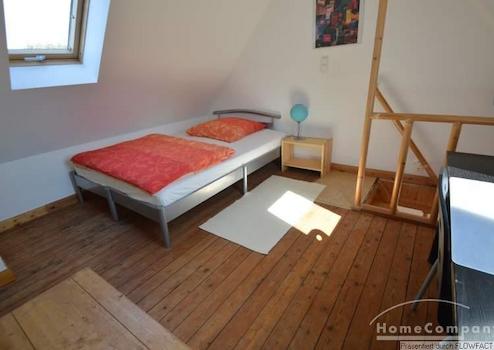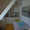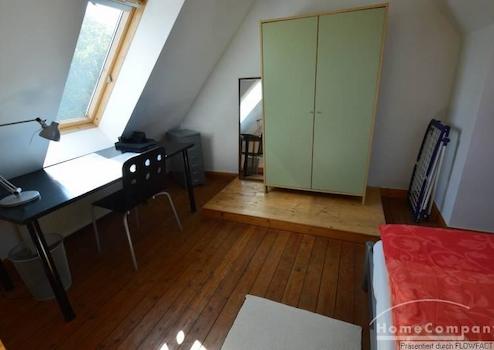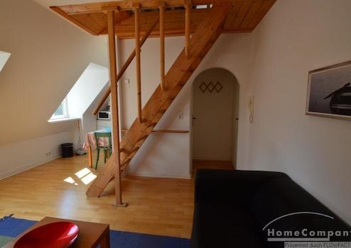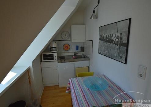 Sehr helle Dachgeschosswohnung über zwei Etagen, die beiden Zimmer sind mit einer offenen Treppe verbunden. Das Wohnzimmer und der Küchenbereich befinden sich in der unteren Etagen. Der Schlaf- und Arbeitsbereich in der oberen Etage. In dem monatlichen Miietzins ist ein wöchentlicher Wechsel der Handtücher und ein 14-tägiger Wechsel der Bettwäsche, sowie eine Wohnungsreinigung inkludiert. Gute Anbindung mit den öffentlichen Verkehrsmitteln. Die Wohnung ist nur für eine Person geeignet.