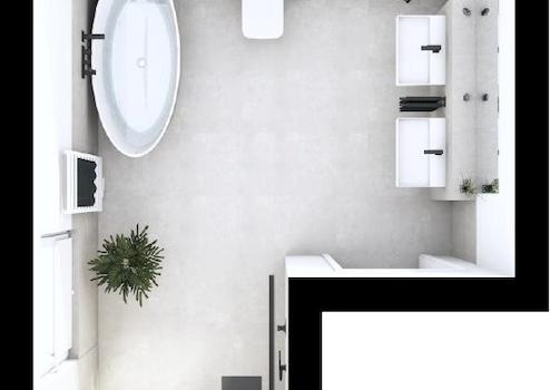 Großflächige Fliesen, hochwertige weiße Keramik namhafter deutscher Marken (wie Villeroy & Boch oder Geberit) sowie moderne schwarze Armaturen der Marke Gessi schaffen ein elegantes Gesamtbild. Die barrierefreien Duschbereiche verfügen über eine stilvolle Bodenablaufrinne. Innenliegende Bäder, WCs und Abstellräume sind mit einer mechanischen Zwangsentlüftung ausgestattet.