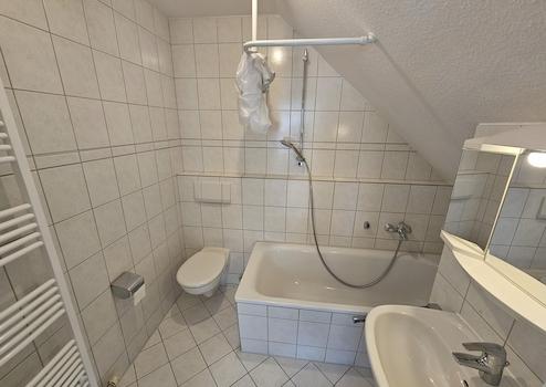 Das Bad überzeugt durch eine Badewanne mit neuer Duschvorrichtung, modernen Armaturen und einen Handtuchheizkörper. Neue Böden und frisch gestrichene Wände in zeitlosen Farbtönen runden das Gesamtbild ab.