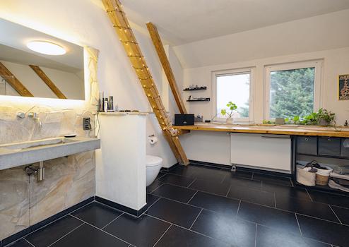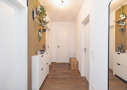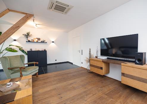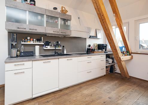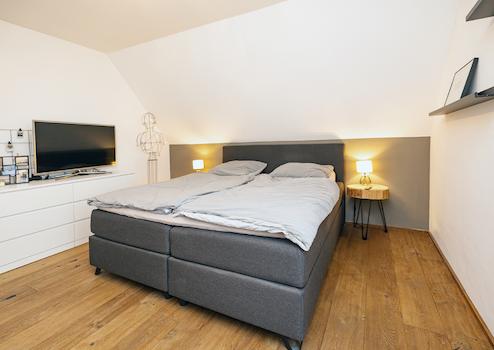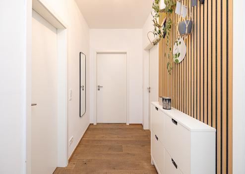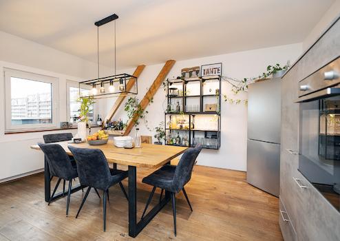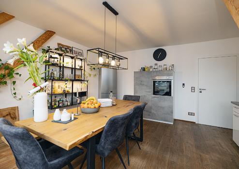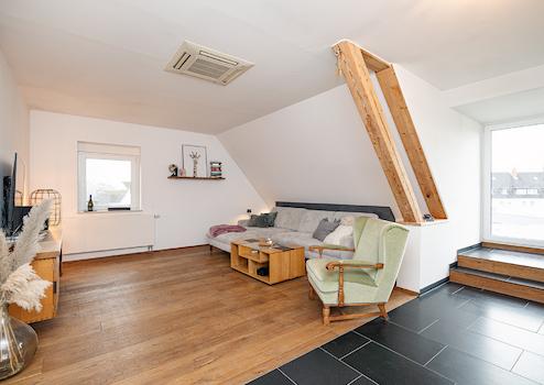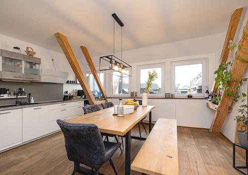 Im 2. Obergeschoss erwartet Sie ein durchdachtes Wohnkonzept, das Eleganz und höchsten Wohnkomfort vereint. Das Herzstück der Wohnung bildet der großzügige, lichtdurchflutete Wohnbereich mit direktem Zugang zur Dachterrasse, der Innen- und Außenraum auf harmonische Weise miteinander verbindet. Der hochwertige Innenausbau mit sichtbaren Deckenbalken, edlen Eichendielen, hochwertigen Innentüren und exklusiven Badarmaturen unterstreicht den gehobenen Anspruch dieser Immobilie und verleiht jedem Raum ein einzigartiges, warmes Ambiente.