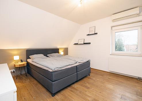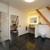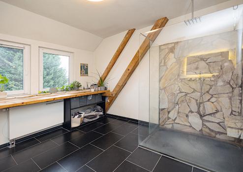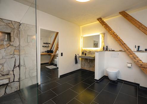 Das stilvolle Badezimmer überzeugt mit edlen Natursteinfliesen und einer großzügigen Walk-In-Dusche, die ein modernes Spa-Gefühl vermittelt. Eine Klimaanlage im Wohn- und Schlafzimmer sorgt ganzjährig für ein angenehmes Raumklima.