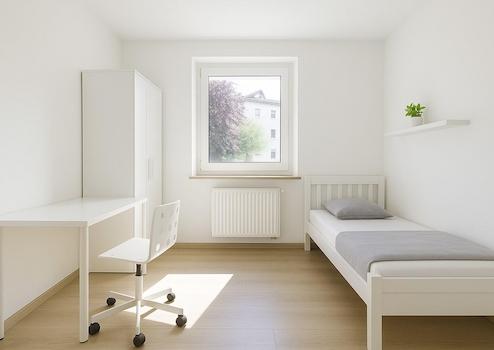 Alle Zimmer (Einzelzimmer auch zu vermieten) sind lichtdurchflutet und bereits bezugsfertig mit Bett, Kleiderschrank, Schreibtisch und Stuhl ausgestattet: