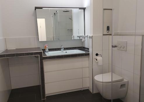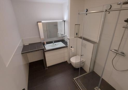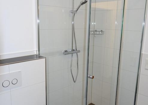 Das Bad besticht durch die helle und funktionale Ausstattung sowie ein eigenen Stellplatz für eine Waschmaschine. Eine schöne begehbare Dusche rundet das Badezimmer ab.