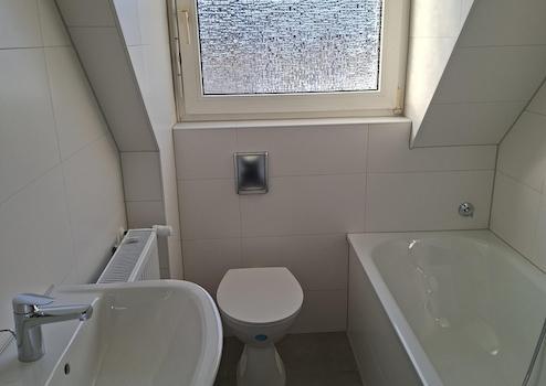 Das Badezimmer ist klein und verfügt über eine Dachschräge: Duschen in der Badewanne ist für größere Personen nicht möglich!