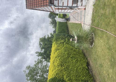 Schöne Lage in einer Sackgasse mit schönem Garten, Hochbeeten, Teich, großen Regenwasserzisternen und genehmigtem Gewächshaus, mit Garage im Nebengebäude.