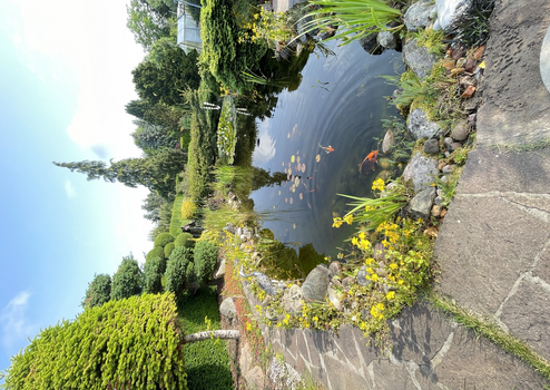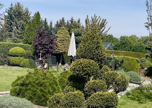 Der große Garten mit Teich und pflegeleichten Laub- und Nadelgehölzen bietet viel Platz zur Entspannung und freien Gestaltung.