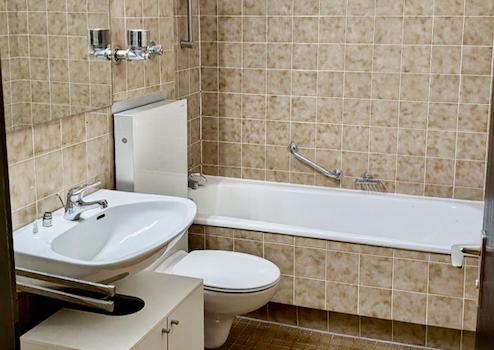 Die Innentüren sind in Holzausführung und teilweise verglast, was ein für ein helles und angenehmes Wohnambiente sorgt. Das Bad ist mit Wanne, Waschtisch und Toilette ausgestattet. Ein Waschmaschinenanschluss ist ebenfalls vorhanden. Die Wohnung ist aufgeteilt in ein Wohnzimmer, ein Schlafzimmer, Küche, Flur und Bad sowie einen Loggia-Balkon. Küche und Bad sind mit Fliesen ausgestattet. Flur, Schlafzimmer und Wohn-/Essbereich sind mit hochwertigem Echtholzparkett verlegt. Die moderne Einbauküche mit ausreichend Stauraum und komfortablen Elektrogeräten verfügt über Geschirrspüler, Kühl-/Gefrierkombination, Dunstabzug und Spüle.