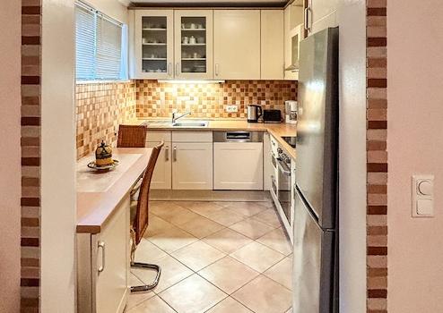 Diese 3-Zimmer Wohnung hat Süd-West Ausrichtung und ist voll möbliert und hat aus allen 3 Zimmern den Ausgang auf die Terrasse. Die Küche ist in einem gemütlichen spanisch wirkenden Still entworfen worden und ist durch einen verfliesten Rundbogen zu begehren. Die Sauna aus Fichtenholz mit finnischem Saunaofen, Außensteuerung und regelbarer Abluft, sowie Saunalampe für 4 Personen eingerichtet.