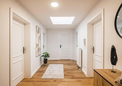 Die Raumaufteilung ist äußerst gelungen: Alle Zimmer sind separat vom Flur aus begehbar und bieten vielfältige Nutzungsmöglichkeiten. Die hochwertige Materialauswahl unterstreicht den Qualitätsanspruch der Wohnung – verlegt wurde edles Echtholz-Eichenparkett, das ein warmes und stilvolles Ambiente schafft. Das Badezimmer ist zusätzlich mit einer komfortablen Fußbodenheizung ausgestattet.