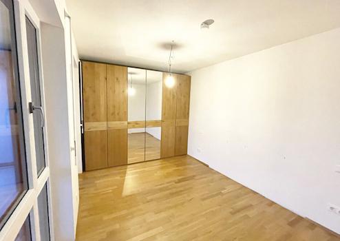 Vom Wohnbereich aus gelangt man sowohl auf den Balkon als auch in das Schlafzimmer, das über einen maßgefertigten Kleiderschrank aus Eichen-Vollholz verfügt und mitvermietet wird.
