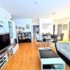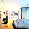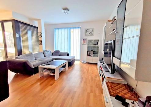 • 1 großes, helles Wohnzimmer mit bodentiefer Verglasung und Jalousien