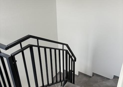 - Treppenhaus gefliest und mit hochwertigem Absturzgeländer anthrazit im französischen Stil
