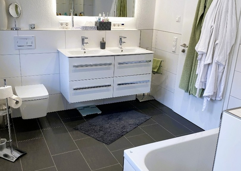 • Großformatige Boden-/Wandfliesen in Bad, Gäste-WC & Abstellraum