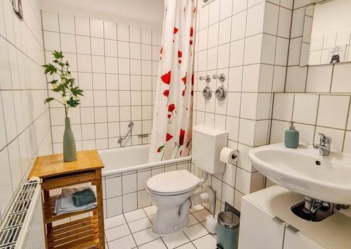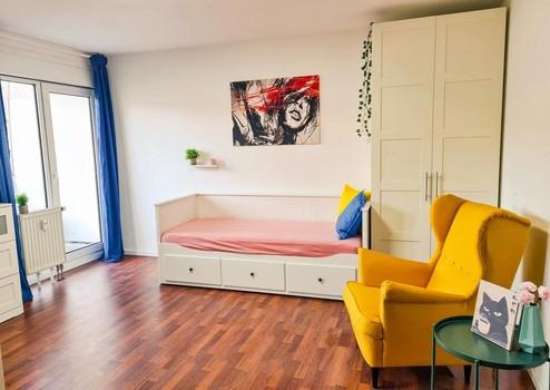 The apartment is centrally located in Nuremberg, right next to the Muggenhof subway station (U1) on a side street, and has a balcony facing the quiet courtyard. It is centrally located with good transport connections, yet still quiet.