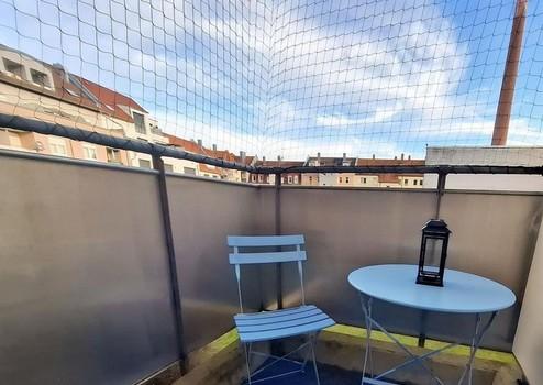 - Balkon: Teppich, Set mit Tisch und zwei Stühlen und Abschirmung gegen Vögel