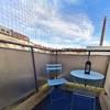 - Balcony: carpet, set with table and two chairs, and bird screen