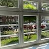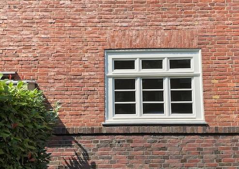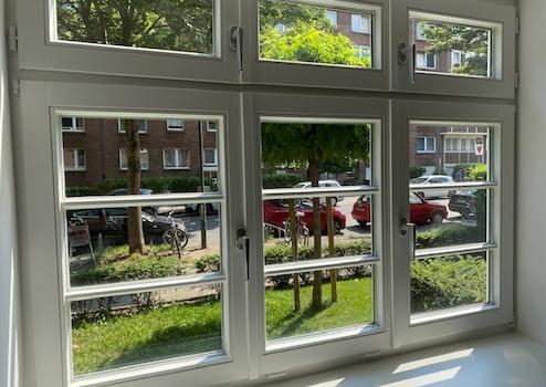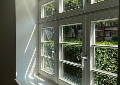 - Holz-Sprossen-Fenster (mit Isolierverglasung) im originalen Teilungsraster aus der Erbauungszeit,