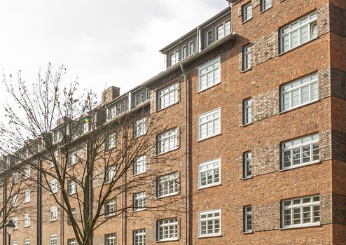 Die Häuserzeile mit ihrer dezent gegliederten Backsteinfassade,