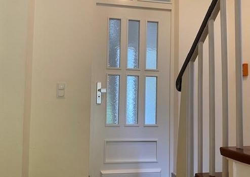- massive Wohnungstür in Holz-/Glaskonstruktion mit Dreifach-Verriegelung,
