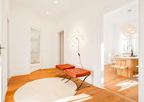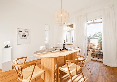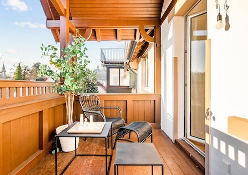 Im Inneren erwarten Sie großzügige, lichtdurchflutete Räume mit eindrucksvoller Deckenhöhe. Hochwertige Echtholz-Parkettböden, eine stilvolle Materialauswahl und eine durchdachte Raumaufteilung schaffen ein Wohnambiente von bleibender Qualität. Der Balkon wird zum verlängerten Wohnraum – ein Ort für Morgenkaffee mit Bachrauschen oder stille Abende mit Burgblick.