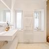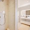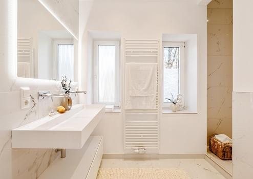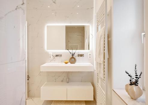 Exklusives Badezimmer mit XXL bodentiefer Dusche, Doppel-Waschbecken, Unterputz-Wandarmaturen, Spiegel mit indirekter Beleuchtung