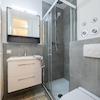 Modernes Bad mit Regendusche und Glasduschkabine, Waschtisch mit zwei Auszügen, dreiteiligem Spiegelschrank, Großer Handtuchheizkörper sowie programmierbare Fußbodenheizung