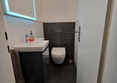 Die Einliegerwohnung mit ca. 45 m² Wohnfläche ist über einen separaten Eingang erreichbar und bietet ein bis zwei Zimmer, ein Duschbad, eine Einbauküche sowie eine eigene Terrasse. Aktuell wird diese Einheit als Homeoffice genutzt, eignet sich jedoch ebenso ideal für Gäste, Angehörige oder zur Vermietung.