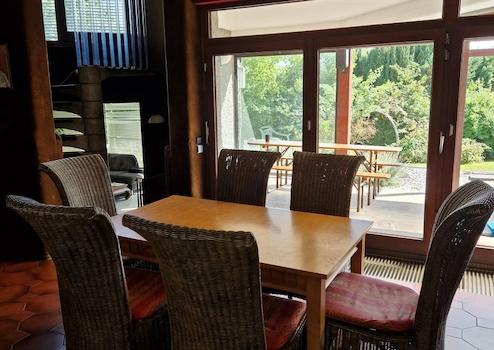 Das großzügige Esszimmer bietet auch für größere Gesellschaften ausreichend Platz und überzeugt durch seine Helligkeit und Offenheit. Von hier aus gelangen Sie auf die weitläufige, teilweise überdachte Hauptterrasse, die harmonisch in das Grundstück integriert wurde und zusätzliche Aufenthaltsqualität bietet. Die Option zur Errichtung eines Wintergartens eröffnet weiteres Ausbaupotenzial. Angrenzend an das Esszimmer befindet sich die Küche.
