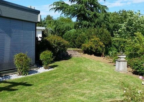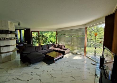 Die insgesamt sieben Zimmer bieten großzügige Rückzugsorte und vielseitige Nutzungsmöglichkeiten, darunter bis zu vier Schlafzimmer. Herzstück der Villa ist der repräsentative Wohnbereich, der nahezu vollständig aus großzügigen Glaselementen besteht und einen freien Blick in den nicht einsehbaren, liebevoll gestalteten Garten ermöglicht. Bodentiefe Fenster sowie direkte Zugänge zu den Terrassen schaffen fließende Übergänge zwischen Innen- und Außenbereich und unterstreichen das offene Wohnkonzept.