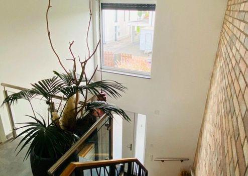 Der Eingangsbereich begrüßt Sie mit einer eleganten Galerie, die das Haus mit einem einladenden Ambiente empfängt. Die Flurwand ist mit stilvollen Klinkerriemchen versehen, die dem Flur eine Vintage-Note verleihen.